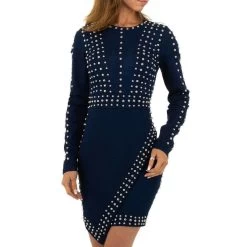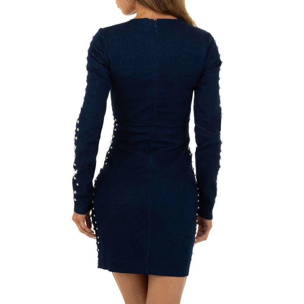 Dit trendy donkerblauwe jeans jurkje heeft een aansluitend model, heeft lange mouwen en is versierd met zilverkleurige studs. Het jurkje heeft een ronde halslijn en heeft een rits aan de achterkant. Geschikt voor maat M, L en XL. Verkrijgbaar in verschillende kleuren.