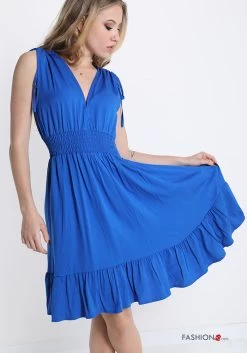 Dit jurkje heeft volants, heeft strikjes op de schouders en heeft een soepel vallende stof. Gemaakt van polyester en elastan. Geschikt voor maat M t/m XL. Verkrijgbaar in legergroen en koningsblauw.