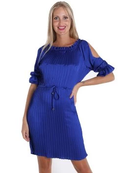 Dit koningsblauwe jurkje heeft een wijd model, is geplooid, heeft openschouders en heeft een koordje. Geschikt voor maat S t/m L. Gemaakt van viscose.
