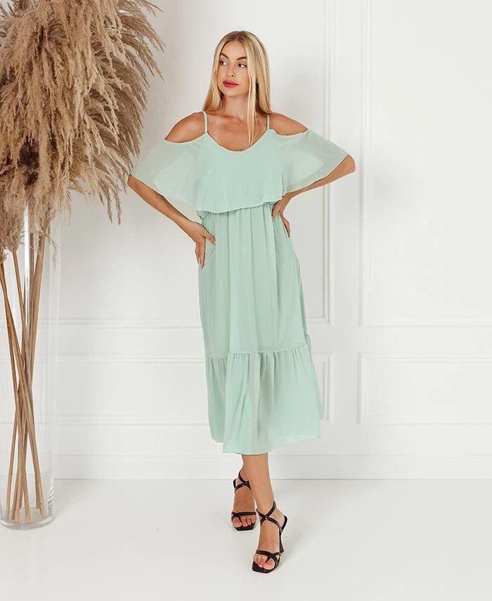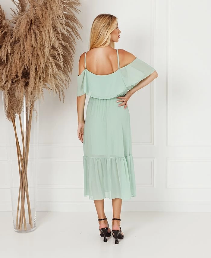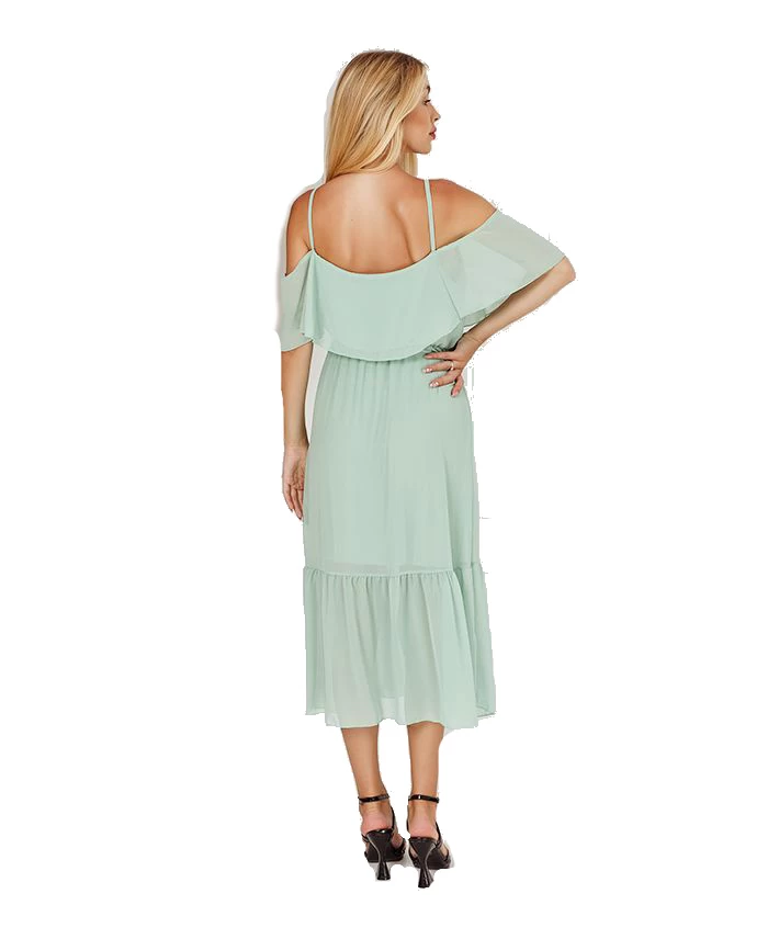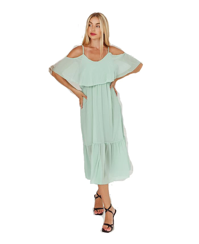 Dit prachtige lichtgroene lange jurk heeft een off-shoulder model, heeft een a-lijn model en heeft ruches. Een jurk gemaakt van viscose en spandex. Het jurkje is een onesize, is geschikt voor maat S t/m XL. Verkrijgbaar in verschillende kleuren.