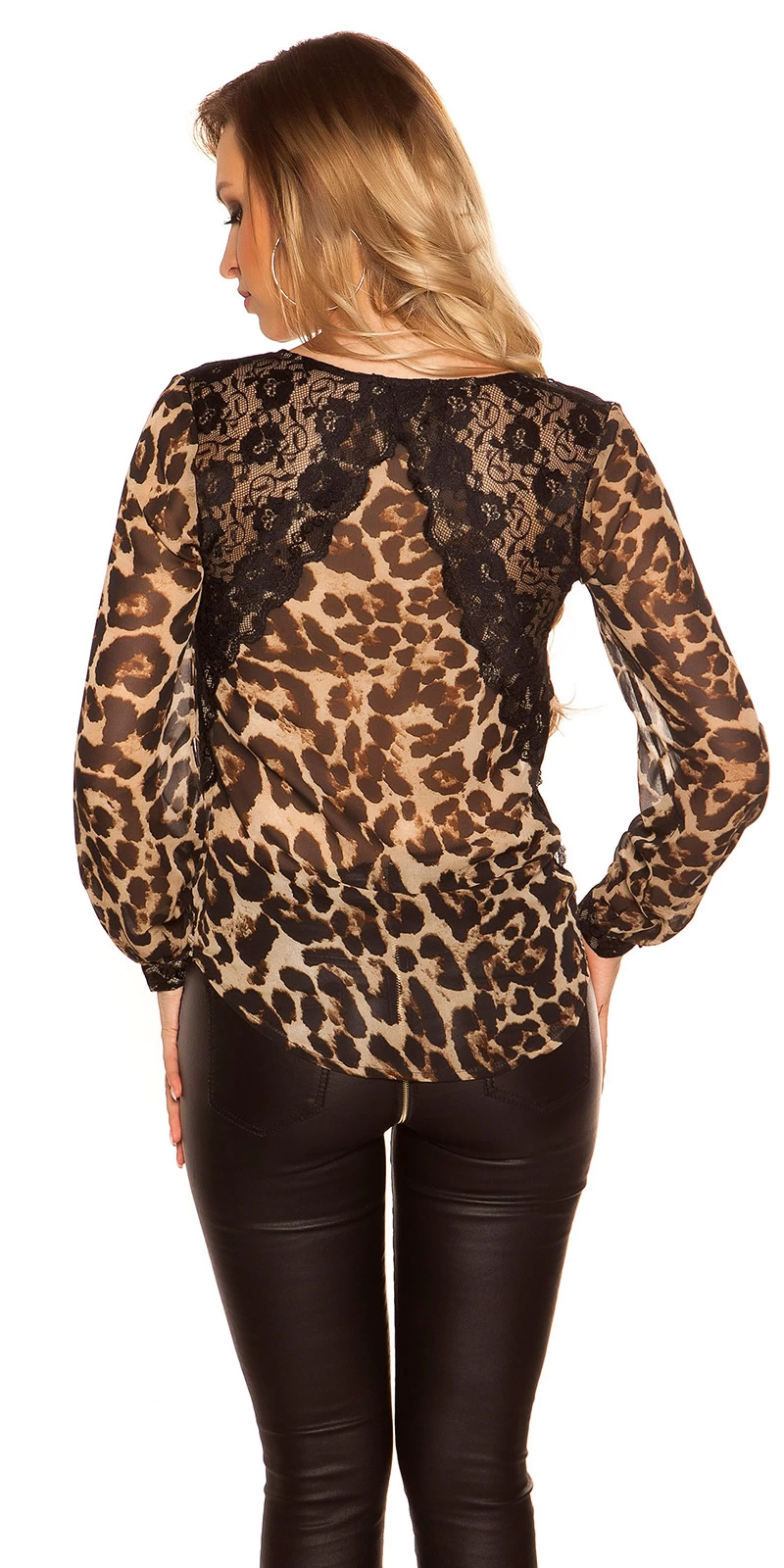 Dit trendy blousje heeft een luipaardprint, heeft kant en heeft een wraplook. Geschikt voor maat M t/m XL. Gemaakt van polyester en elastan.