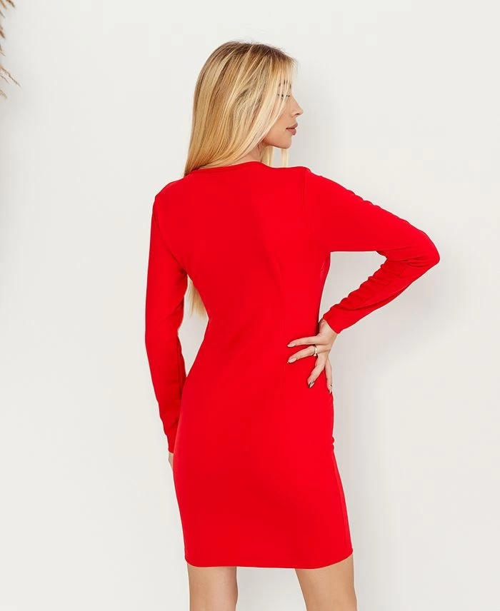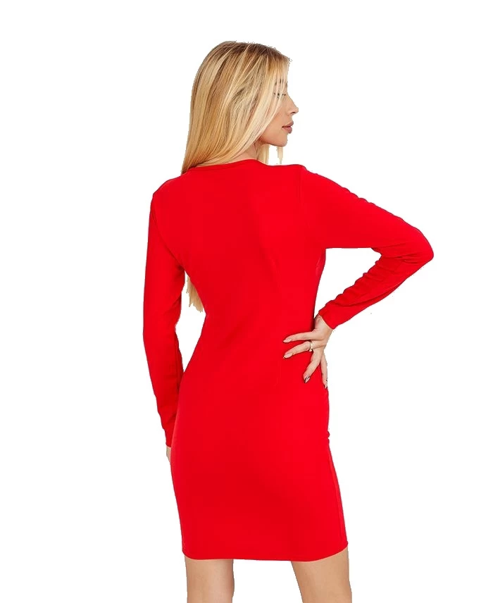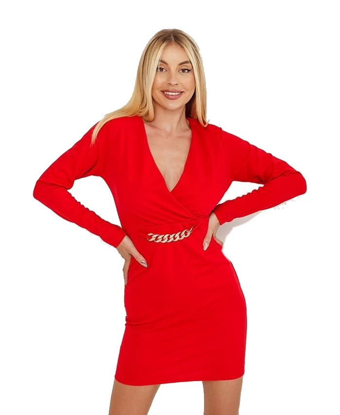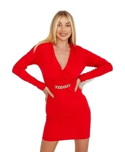 Dit elegante rode jurkje heeft lange mouwen, heeft een diepe v-halslijn en heeft een goudkleurige kettinkje. Het jurkje is een onesize, is geschikt voor maat S, M en L. Gemaakt van polyester en elastan. Verkrijgbaar in verschillende kleuren.