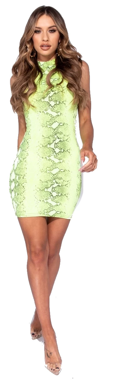 Dit mini jurkje in neon groen en slangenprint heeft een hoge halslijn en heeft een aansluitend model. Een jurk gemaakt van polyester en elastan. Verkrijgbaar in verschillende maten en kleuren.