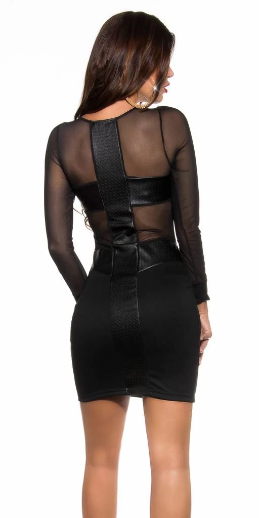 Dit verleidelijke en stijlvolle zwarte feestjurkje heeft een aansluitend model, heeft transparante lange mouwen en heeft een transparante rugkant met lederlook accenten. Een jurkje gemaakt van polyester en katoen. Geschikt voor maat S, M en L. Gemaakt van polyester en elastan.