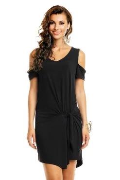 Zwart jurkje met openschouders die versierd zijn met goudkleurige studs. Het jurkje heeft een strik bij de taille die verstelbaar is. Geschikt voor maat M t/m XL. Gemaakt van polyester en elastan.