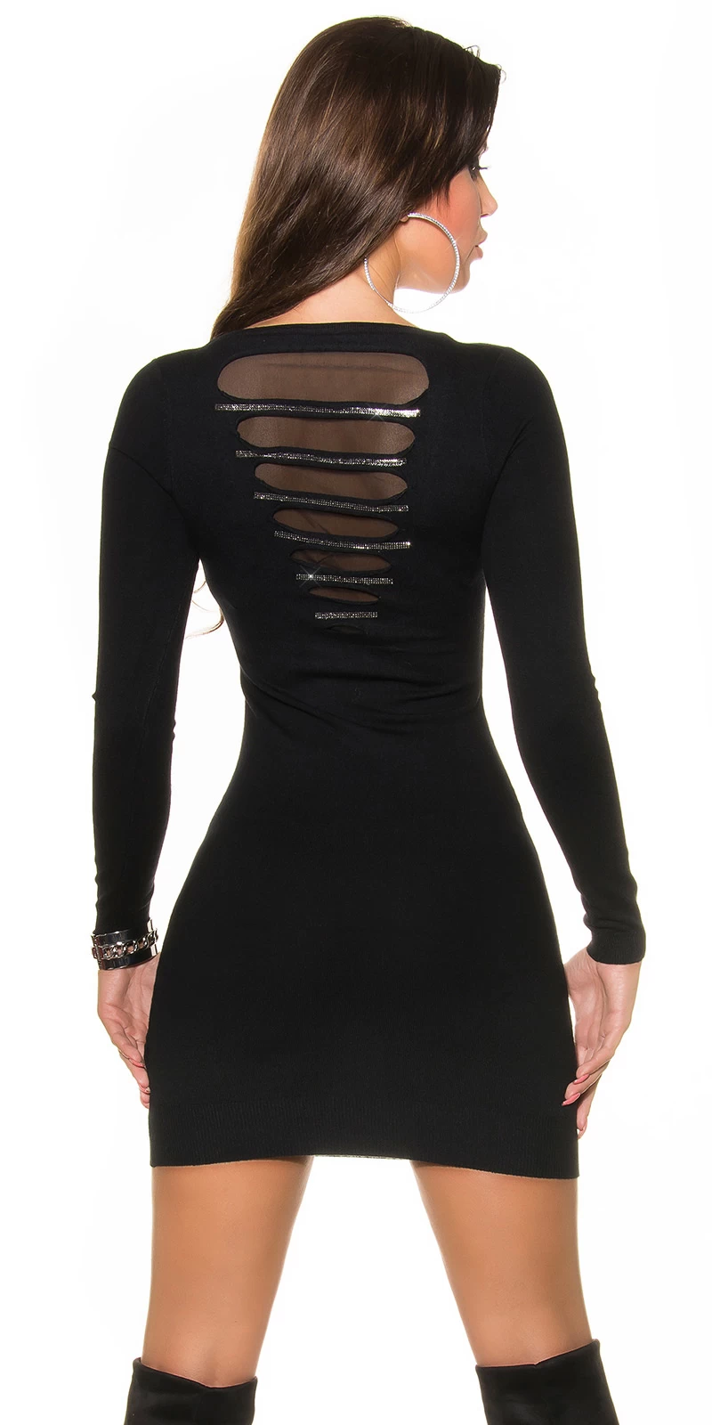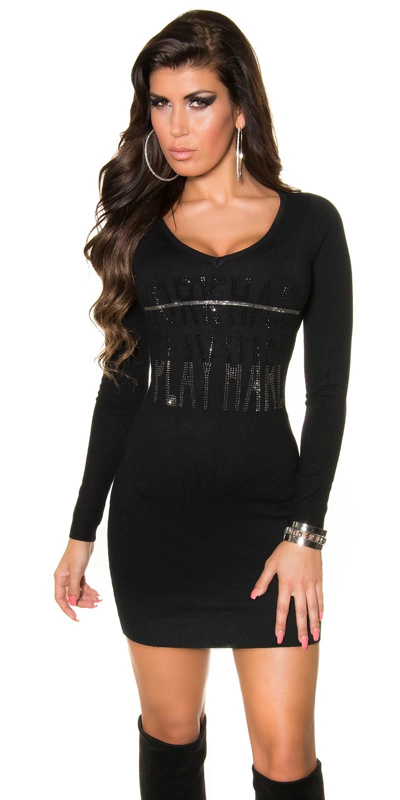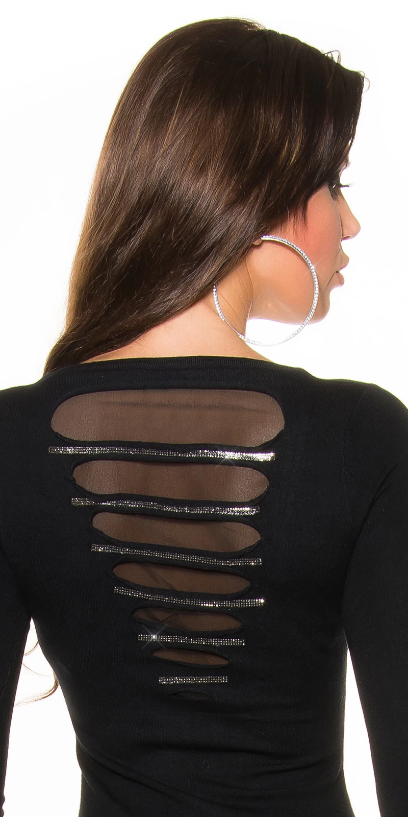 Sexy zwarte lange trui met glittersteentjes aan de voorzijde en aan de achterzijde. Een trui gemaakt van een zacht en soepel materiaal. Geschikt voor maat S t/m L. Gemaakt van viscose, polyamide en polyester.